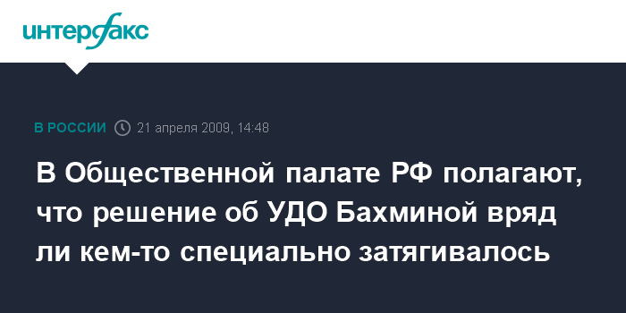 Москва. 21 апреля. INTERFAX.RU - В Общественной палате России считают проявлением гуманизма решение суда об условно-досрочном освобождении (УДО) бывшего юриста "ЮКОСа" Светланы Бахминой и не склонны усматривать чей-либо умысел в том, что процедура освобождения растянулась почти на год.