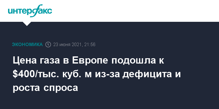 Москва. 23 июня. INTERFAX.RU - Цена газа в Европе за очередной день торгов прибавила еще 3%, вплотную приближаясь к отметке $400 за тысячу кубометров на фоне роста стоимости квот на выбросы углекислого газа, а также растущего спроса и ограниченного предложения.