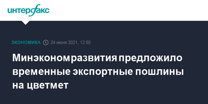 Москва. 24 июня. INTERFAX.RU - Минэкономразвития предлагает ввести временные экспортные пошлины на цветные металлы, которые будут действовать с 1 августа до 31 декабря, заявил глава министерства Максим Решетников на заседании правительства в четверг. После истечения срока действия пошлин ожидается ввод механизма, который позволит на постоянной основе перераспределять в бюджет сверхдоходы от благоприятной конъюнктуры мирового рынка.