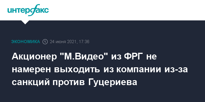 Москва. 24 июня. INTERFAX.RU - Германская Ceconomy, владеющая 15% акций ПАО "М.Видео", не намерена выходить из капитала компании в связи с внесением в санкционные списки Евросоюза Михаила Гуцериева.
