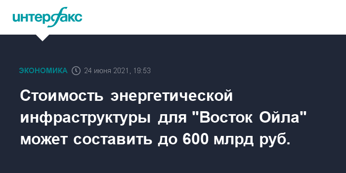 Москва. 24 июня. INTERFAX.RU - ПАО "Интер РАО" оценивает стоимость всей энергетической инфраструктуры (включая генерацию и сети) для проекта "Восток Ойл" в 500-600 млрд руб., сообщил Renaissance Capital по итогам встречи с топ-менеджерами энергохолдинга.