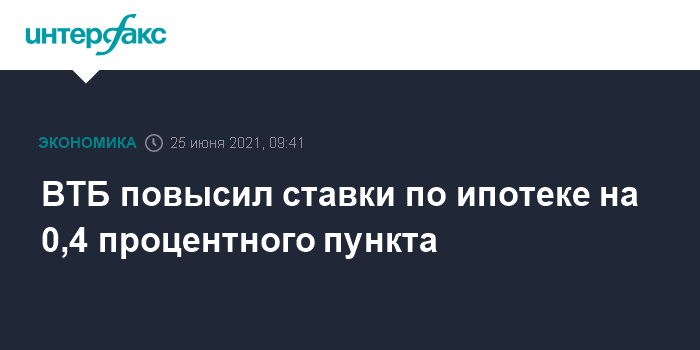 Москва. 25 июня. INTERFAX.RU - ВТБ с 25 июня повышает на 0,4 процентного пункта (п.п.) ставки по ипотеке, решение принято с учетом изменившейся конъюнктуры рынка и в связи с резким повышением ключевой ставки ЦБ, сообщили в пресс-службе банка.
