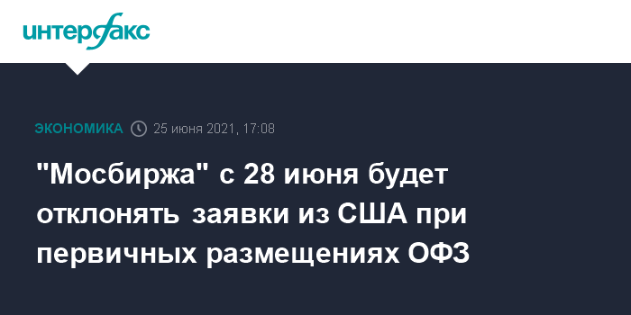"С 28 июня 2021 года при проведении размещений облигаций федерального займа министерства финансов Российской Федерации заявки, поданные за счет клиентов, при регистрации которых в качестве иностранного государства, в котором зарегистрирован данный клиент, были указаны Соединенные Штаты Америки, отклоняются", - говорится в сообщении торговой площадки.
