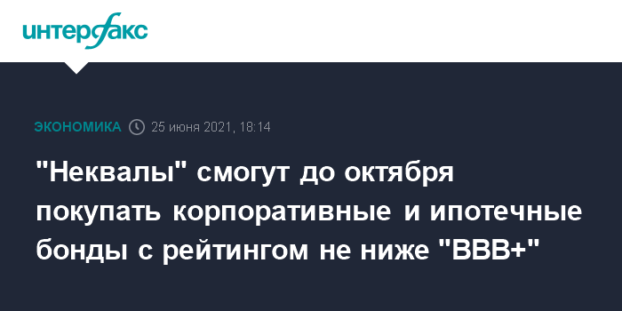 Москва. 25 июня. INTERFAX.RU - Неквалифицированные инвесторы до 1 октября 2021 года смогут покупать облигации российских эмитентов и облигации с ипотечным покрытием (за исключением структурных облигаций и тех бумаг, размер выплат по которым зависит от различных обстоятельств), только если их рейтинг (или рейтинг эмитента) не ниже "ruВВB+" по национальной рейтинговой шкале "Эксперт РА" и "ВВB+(RU)" АКРА.