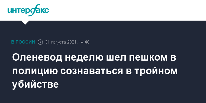 Москва. 31 августа. INTERFAX.RU - В Охотском районе Хабаровского края оленевод неделю пешком шел в полицию, чтобы сознаться в совершении тройного убийства, следует из сообщения регионального СК.