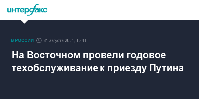 Москва. 31 августа. INTERFAX.RU - На космодроме Восточный завершили годовое техобслуживание (ГТО) оборудования стартового комплекса, сообщили в Центре эксплуатации объектов наземной космической инфраструктуры (ЦЭНКИ). Как ожидается 4 сентября на космодром приедет президент Владимир Путин.