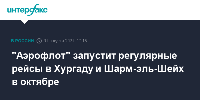 Москва. 31 августа. INTERFAX.RU - "Аэрофлот" открыл продажу билетов на прямые регулярные рейсы из Москвы на курорты Египта. Эти рейсы будут выполняться ежедневно с 1 октября.