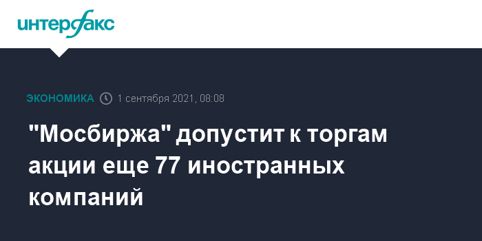 Москва. 1 сентября. INTERFAX.RU - "Московская биржа" с 1 сентября со среды начинает торги акциями еще 77 иностранных компаний, среди которых бумаги Robinhood, MSCI, Pinterest, Beyond Meat, JPMorgan Chase & Co. и News Corp.