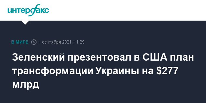 Москва. 1 сентября. INTERFAX.RU - Президент Украины Владимир Зеленский в рамках рабочего визита в США принял участие в презентации плана трансформации Украины перед представителями американских аналитических центров и журналистами, сообщает пресс-служба главы государства.