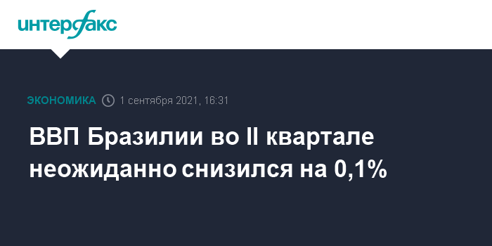 Москва. 1 сентября. INTERFAX.RU - Во II квартале 2021 года экономика Бразилии во втором квартале неожиданно продемонстрировала слабое снижение из-за перебоев в цепочках поставок и падения показателей сельскохозяйственной отрасли в связи с плохим урожаем кофе.