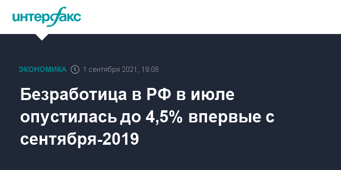 Безработица в РФ в июле опустилась до 4,5% впервые с сентября-2019