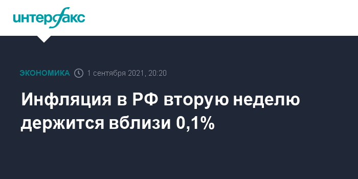 Москва. 1 сентября. INTERFAX.RU - Инфляция в РФ с 24 по 30 августа вторую неделю подряд осталась на высоком для августа уровне - 0,09% после 0,10% с 17 по 23 августа, дефляции в 0,01% с 10 по 16 августа, нулевой инфляции с 3 по 9 августа и дефляции в 0,06% с 27 июля по 2 августа, приводятся цифры в сообщении Росстата.