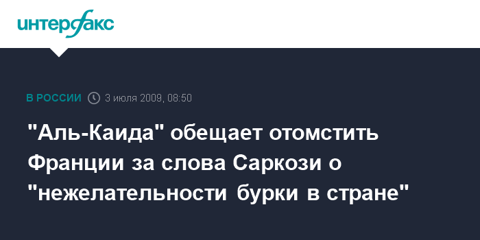 Москва. 3 июля. INTERFAX.RU - "Аль-Каида" угрожает "отомстить Франции всеми средствами и везде" за дебаты по поводу бурки - традиционного исламского женского головного убора, полностью закрывающего лицо.
