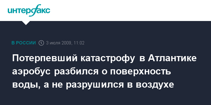 Москва. 3 июля. INTERFAX.RU - Аэробус А-330 авиакомпании "Air France", разбившийся над Атлантикой, был абсолютно исправен и разрушился не в воздухе, а от удара о водную поверхность при сильной скорости, заявляют в следственной группе Бюро расследования авиапроисшествий Франции. "Самолет был в хорошем состоянии, никаких нарушений не отмечено. Он вылетел из Рио без технических проблем", - сказал руководитель следственной группы Ален Буийяр на пресс-конференции в Ле Бурже. У экипажа не было проблем со связью, и никаких сигналов бедствия не было отмечено ни другими самолетами, ни диспетчерами, ни спутниками, добавил он.