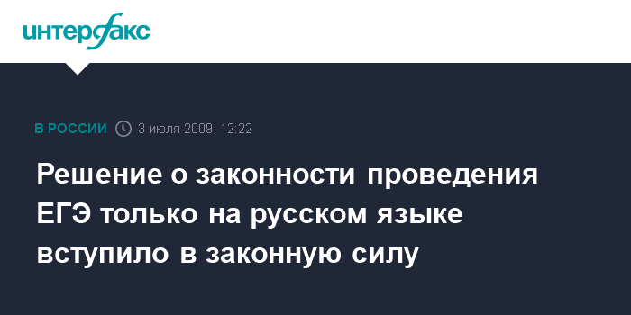 Москва. 3 июля. INTERFAX.RU - Кассационная коллегия Верховного суда РФ подтвердила законность проведения Единого госэкзамена (ЕГЭ) только на русском языке.