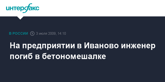 Иваново. 3 июля. INTERFAX.RU - Следственный отдел по городу Иваново СУ СК при прокуратуре РФ по Ивановской области проводит проверку по факту гибели на рабочем месте главного инженера предприятия "Ивбетон", сообщили "Интерфаксу" в пятницу в Следственном управлении.