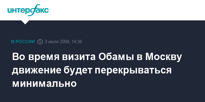 Москва. 3 июля. INTERFAX.RU - Движение автотранспорта по улицам в центре Москвы во время визита президента США Барака Обамы будет перекрываться "точечно" на время проезда кортежа, сообщили "Интерфаксу" источник в правоохранительных органах в пятницу.