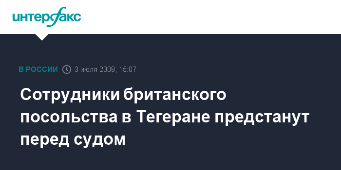 Лондон. 3 июля. INTERFAX.RU - Иранские сотрудники посольства Великобритании в Тегеране, которых обвинили в участии в протестах после подведения итогов президентских выборов в стране, предстанут перед судом, сообщает BBC. Она процитировала слова руководителя Совета стражей конституции Ирана аятоллы Ахмада Джаннати.