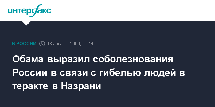 "Я глубоко обеспокоен сообщениями о совершенном террористом-смертником теракте в Назрани (Ингушетия), унесшем жизни как минимум 20 человек и ранившем 138" - говорится в заявлении Б.Обамы, распространенном Белым домом.