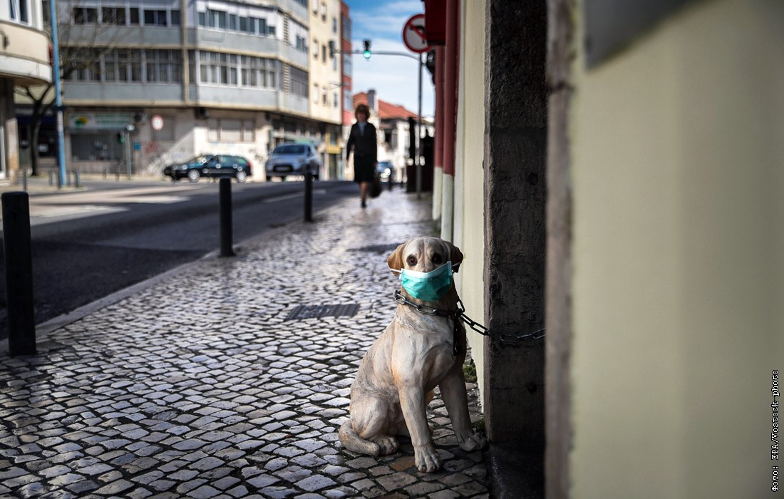 11 марта ВОЗ объявила пандемию в связи с COVID-19. На фото: собака в защитной маске возле ресторана в Лиссабоне, Португалия.