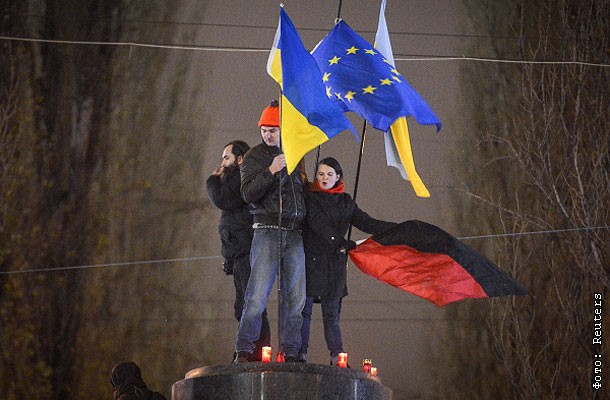 Участники акции в поддержку евроинтеграции Украины стоят на постаменте памятника Ленину, снесенного ими на Бессарабской площади в центре Киева.