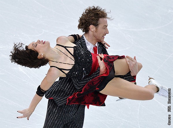 Натали Пешала и Фабьян Бурза (Франция) выступают в короткой программе танцев на льду на соревнованиях по фигурному катанию на XXII зимних Олимпийских играх в Сочи.