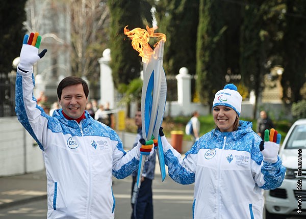 Старший вице-президент оргкомитета "Сочи-2014" Денис Секачев и факелоносец Александра Ступко во время эстафеты паралимпийского огня в Сочи.