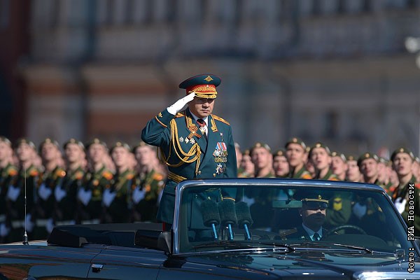 Министр обороны РФ Сергей Шойгу объезжает пешие парадные расчеты Шойгу во время военного парада.