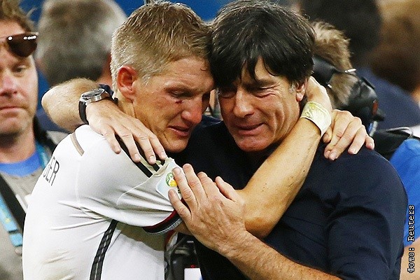 Бастиан Швайнштайгер поздравляет с победой главного тренера сборной Германии Йоахима Лева.
