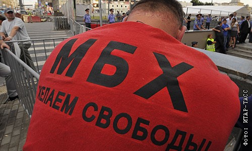 В воскресенье оппозиция провела акцию в защиту 31-й статьи Конституции РФ в необычной форме - митинг на этот раз был "сидячим"% около 40 участников акции расположились на асфальте с плакатами рядом с Концертным залом имени Чайковского и на углу площади около ресторана "Пилзнер"