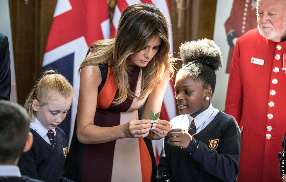 В пятницу, 13 июля, первая Леди США посетила Королевский госпиталь в Челси, где встретилась с ветеранами военных действий и местными школьниками