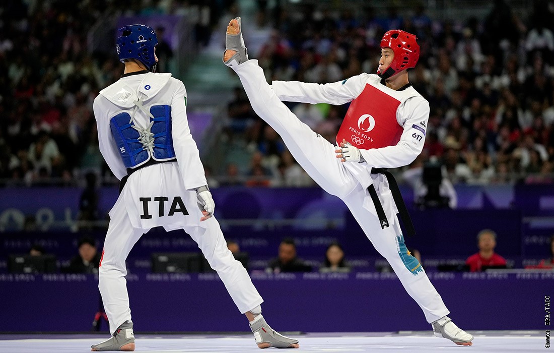 Симоне Алессио из Италии и Батырхан Толеугали из Казахстана в предварительном раунде по тхэквондо