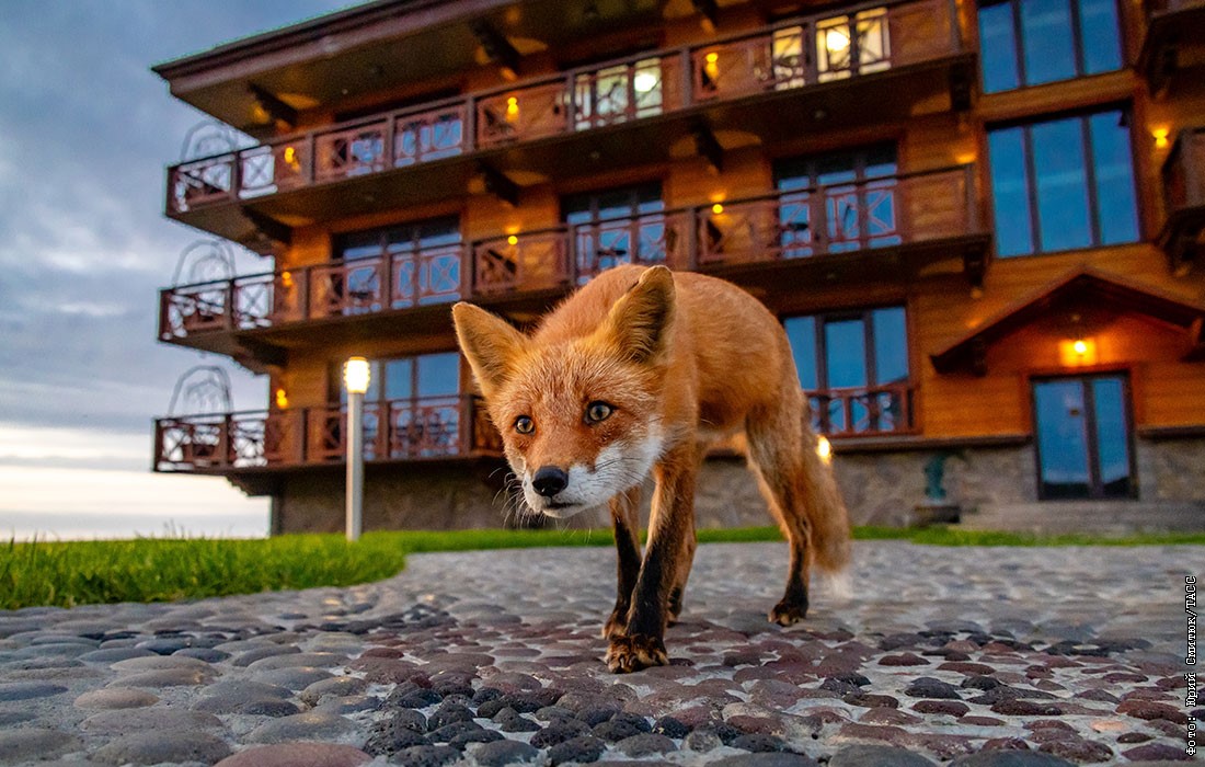 Лиса на территории гостиничного комплекса на острове Итуруп, Россия
