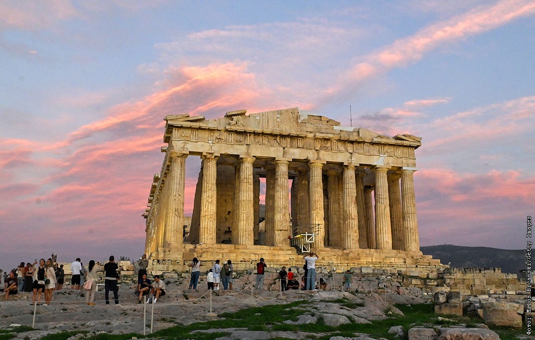 Туристы перед Парфеноном в Афинах. Строительные леса, установленные 15 лет назад для проведения реставрационных работ, недавно были демонтированы.