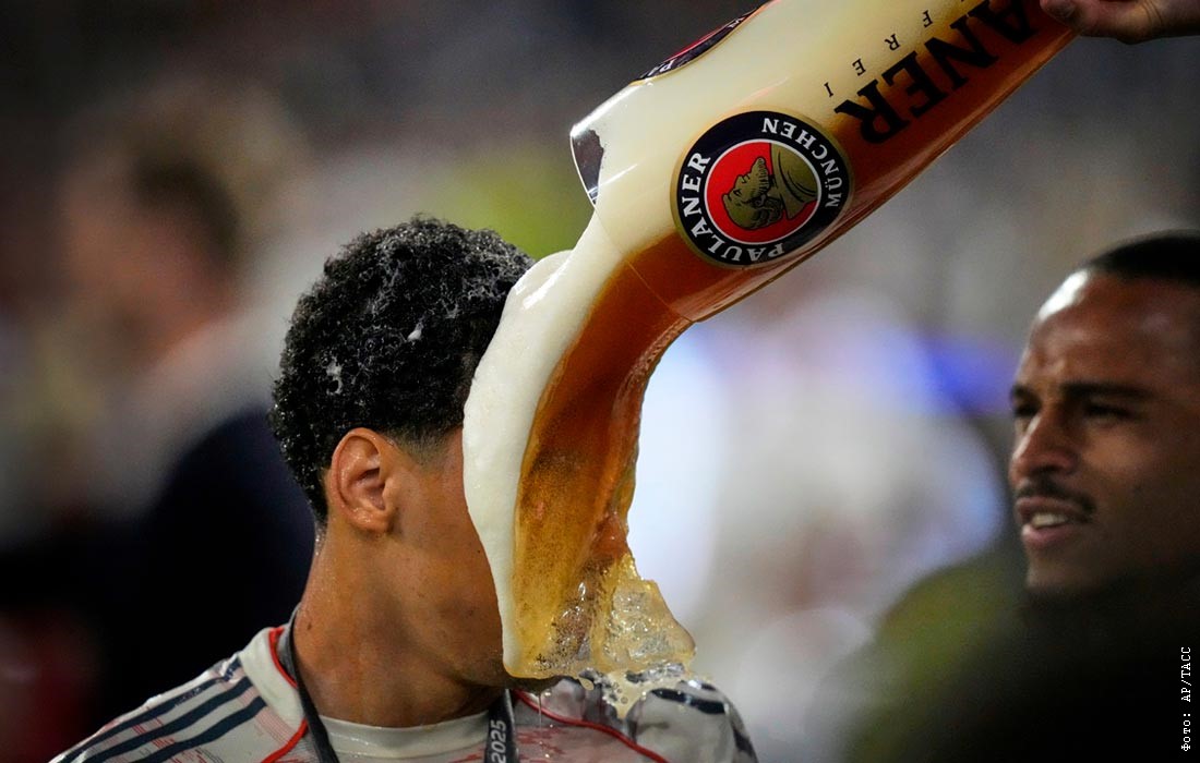 Футболиста "Баварии" Джамаля Мусиалу обливают пивом после матча с "Боруссией" в Мюнхене