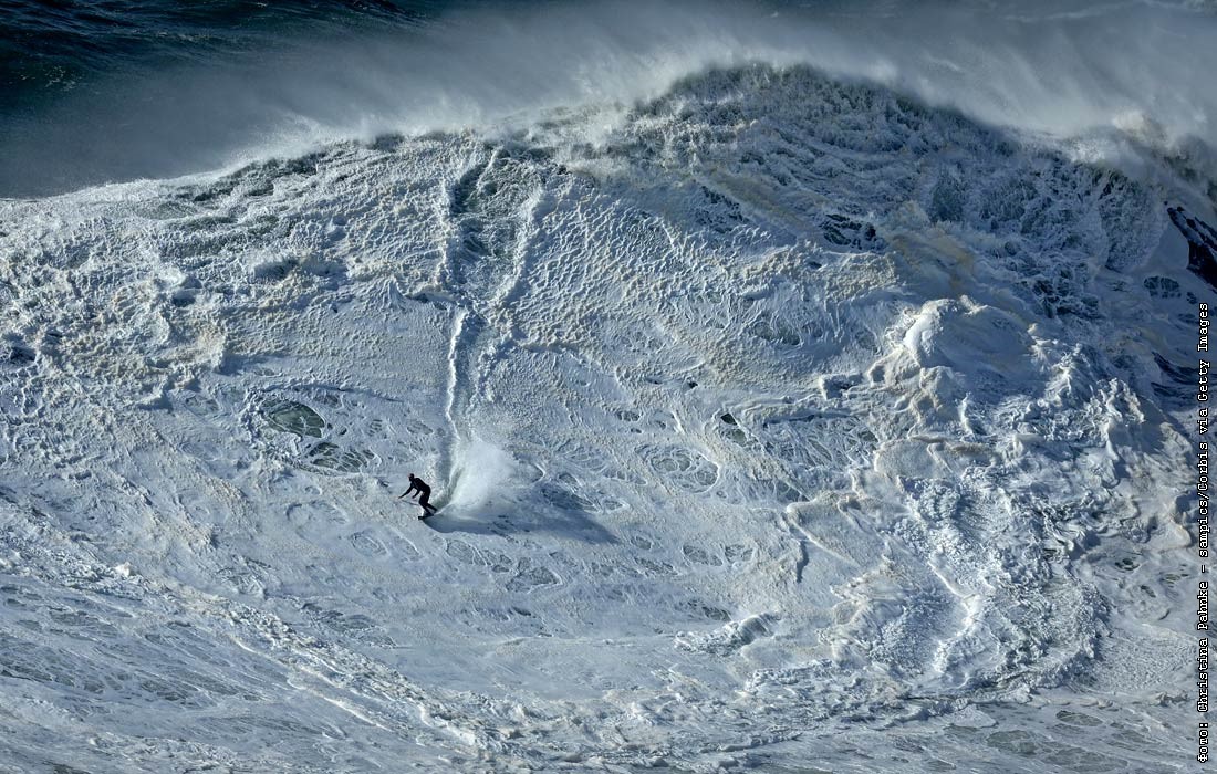 Серфинг во время сезона больших волн в португальском Назаре