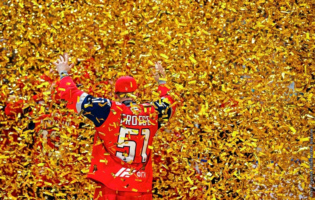 Хоккеист "Локомотива" Байрон Фрэз радуется победе в финале плей-офф чемпионата КХЛ в Ярославле