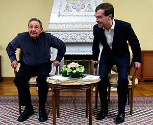 "Стратегическое партнерство, которое мы согласовали в коммюнике, отражает то, чего мы достигли и к чему стремимся в будущем", - сказал Кастро на переговорах в Кремле в расширенном составе. Со своей стороны Медведев подчеркнул, что у Москвы и Гаваны "есть хорошие условия, чтобы вывести наши отношения на стратегический уровень". "Думаю, что ваш визит откроет новую страницу в истории дружеских российско-кубинских отношений, будет означать их выход на уровень стратегического партнерства", - подтвердил Медведев, обращаясь к кубинскому гостю.